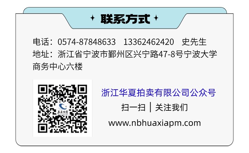 二、展示看样:即日起至2023年12月15日止,与拍卖公司联系看样事宜。联系电话:金诚拍卖13906684730(林),华诚拍卖13819853206(王),华夏拍卖13362462420(史);可直接加微信咨询了解拍卖事项。
