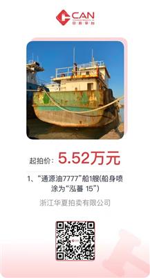 (一)“通源油7777”船1艘(船身喷涂为“泓蕃 15”)。起拍价:55200元,保证金:10000元。