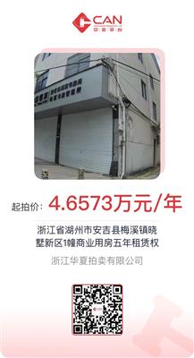 位于湖州市安吉县梅溪镇晓墅新区1幢商业用房租赁权,租赁期限为5年。首年起租价:46573元,保证金:10000元。