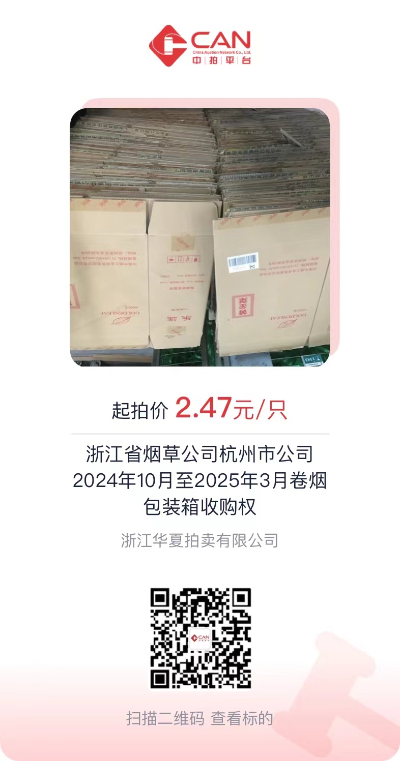 一、拍卖标的:浙江省烟草公司杭州市公司2024年10月至2025年3月卷烟包装箱收购权。预计数量约为47万只(根据上一年度同期产生数量测算,实际数量以合同周期内按实结算),起拍价2.47元/只,拍卖保证金10万元。