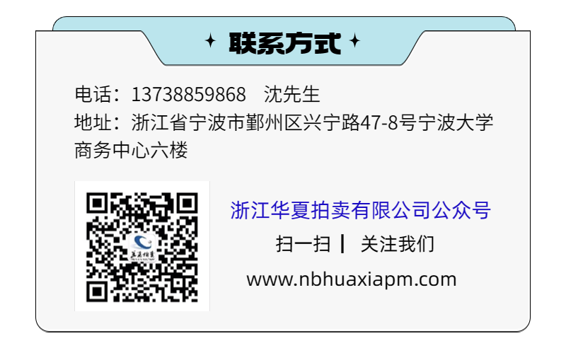 三、展示及咨询报名:即日起至2024年11月21日16时(节假日除外)接受咨询、察勘标的。标的以现场实际看样为准。请有意向的竞租人于2024年11月21日16时前将竞租保证金汇入指定账户(户名:浙江华夏拍卖有限公司,开户行:农行宁波曙光支行,账号:39159001040008036),并在中国拍卖行业协会网络拍卖平台注册报名。